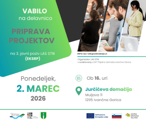 Lokalna akcijska skupina Suhe krajine, Temenice in Krke (LAS STIK) je objavila 3. javni poziv za izbor projektov za uresničevanje Strategije lokalnega razvoja na območju LAS STIK v programskem obdobju 2021–2027, katerega upravičeni stroški bodo sofinancirani iz Evropskega kmetijskega sklada za razvoj podeželja (EKSRP). Višina razpisanih sredstev je do 400.000 evrov, javni poziv pa bo odprt do 18. marca 2026.